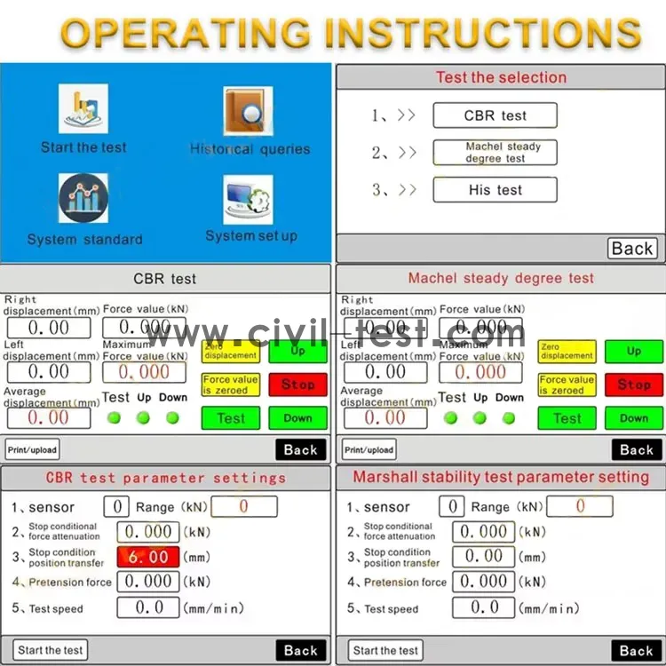 Automatic CBR and Marshall test machine is designed for performing laboratory evaluation of the CBR value of highway sub-bases and sub-grade, and determination of the strength and determine the maximum load and flow values of bituminous mixtures.